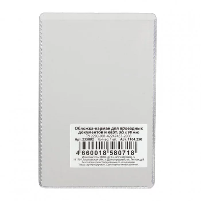Обложка-карман для проездных документов и карт, ПВХ, прозрачный, 65*98, ДПС, 1164.250