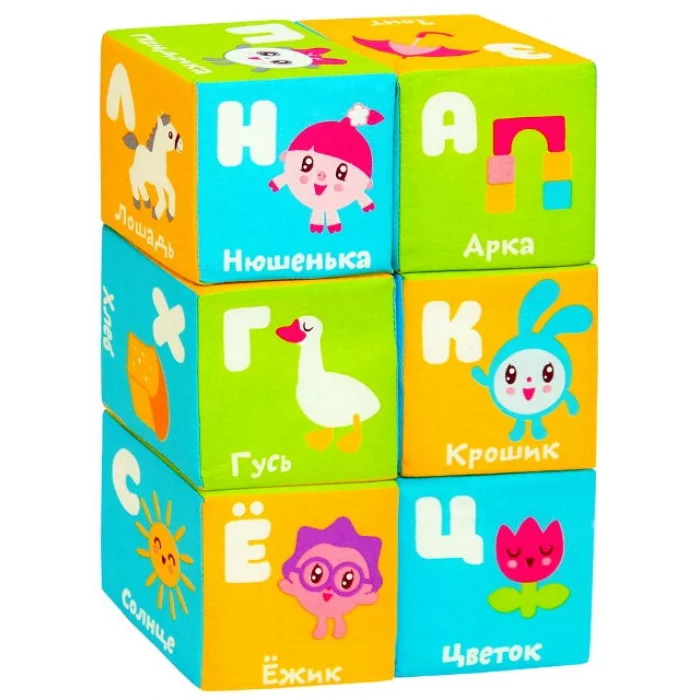 Возраст: от 12 месяцев Комплект: 6 кубиков. Из чего сделана игрушка (состав): текстиль, поролон. Размер упаковки: 30 х 20 х 10 см. Упаковка: пакет. Страна обладатель бренда: Россия. Мягкие кубики "Азбука" из серии "Малышарики" - замечательные обучающие игрушки, которые привлекут внимание своей красочностью и надолго займут малыша. Забавные герои анимационного развлекательно-образовательного мультсериала познакомят ребенка с различными буквами, помогут выучить алфавит. Кубики абсолютно безопасны для ребенка, легкие и не имеют острых углов. В наборе их шесть штук.
