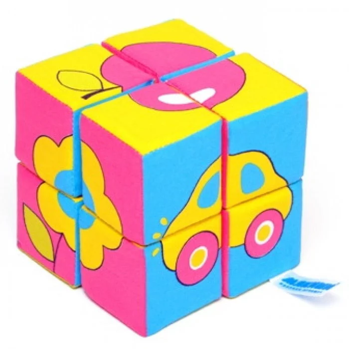 Кубики ""Собери картинку"" Предметы - это яркий набор из 8 мягких кубиков для самых маленьких. Кубики позволят ребёнку овладевать навыками конструирования, помогут развивать его логическое и пространственное мышление, внимание, восприятие цвета и формы, будут тренировать память, совершенствовать мелкую моторику, обогащать словарный запас. Размер кубиков оптимально подобран для маленьких ручек малыша. - 8 кубиков - 6 предметов: яблоко, цветок, машинка, воздушный шарик, утка, пирамидка - звуковые элементы Играя с кубиками ""Предметы"", ребёнок будет учиться: соотносить часть и целое; складывать картинку из частей, подбирая нужное изображение по цвету фона или по фрагментам рисунка; складывать большой куб из восьми маленьких кубиков; складывать из восьми кубиков большой куб, подбирая грани по рисунку; складывать из восьми кубиков большой куб, подбирая грани по цвету. Мягкие кубики, которые можно сжимать и разжимать ручками, помогут развитию моторики рук ребенка. Эт