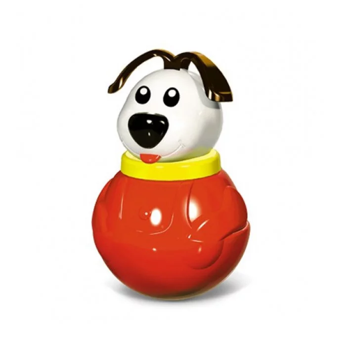 Неваляшка в виде забавной собачки в красной одежде.