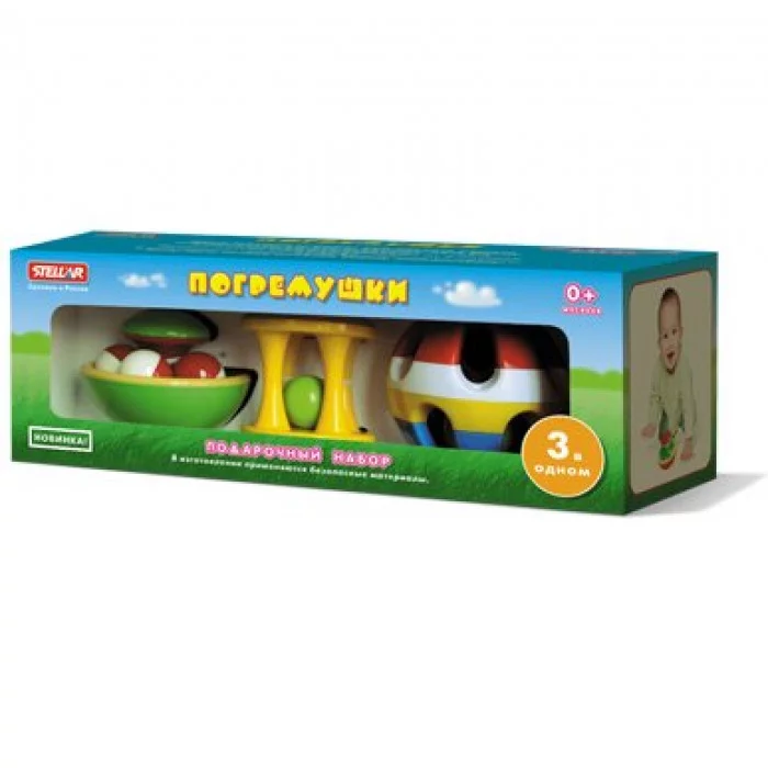 одарочный набор погремушек заинтересует новорожденных своими цветами и звуками перекатывавшихся шариков. Малышей постарше привлечет возможность исследовать погремушки. Им понравится пробовать вытаскивать шарики (шарики не достаются), проталкивать их пальчиками через отверстия, катать игрушки по наклонным и прямым поверхностям.