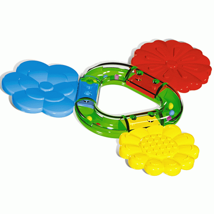 * Погремушка с прорезывателями в виде цветочков с удобной ручкой для держания и цветными шариками внутри.