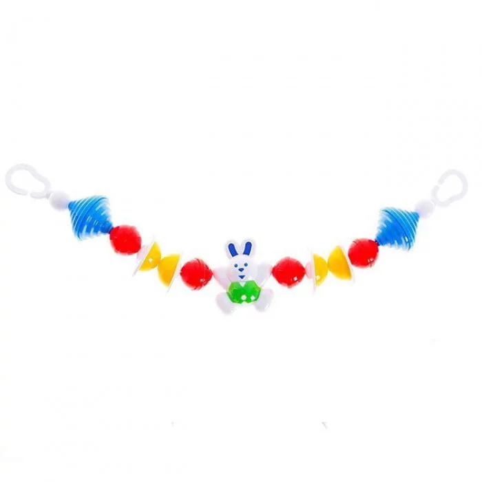 Размер упаковки-20x9x7 см Размер игрушки: 50x4x3 см. Ширина зайчика: 5,9 см. Погремушки-подвески играют важнейшую роль в развитии малыша. Они не только звонко шумят, помогая развивать слух ребенка, но также своим привлекательными внешним видом и яркой расцветкой привлекают его внимание. Малыш стремится дотянуться до игрушки, тем самым делая первые шаги к тому, чтобы учиться самостоятельно поворачиваться и садиться. Подвеска изготовлена из качественного, безопасного для детей пластика.