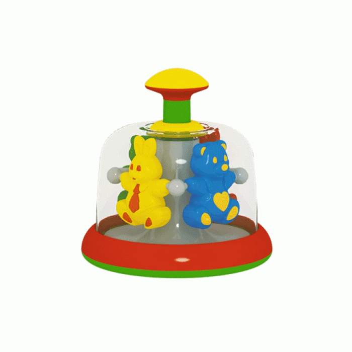 Малыш сможет сам запускать юлу-карусель и следить за тем, как зверушки в нарядных костюмах кружатся вокруг своей оси под веселую народную мелодию.