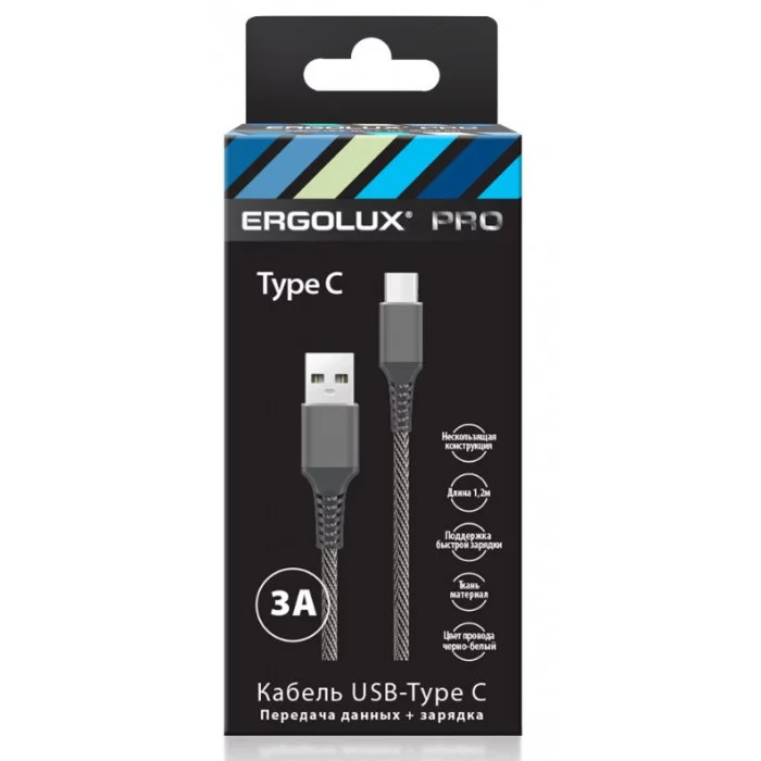 Кабель USB-Type C, 3А, 1,2м, Черный-белый, Ткань, Зарядка+ПД, Коробка ELX-CDC08-C41 ERGOLUX 4895117898505