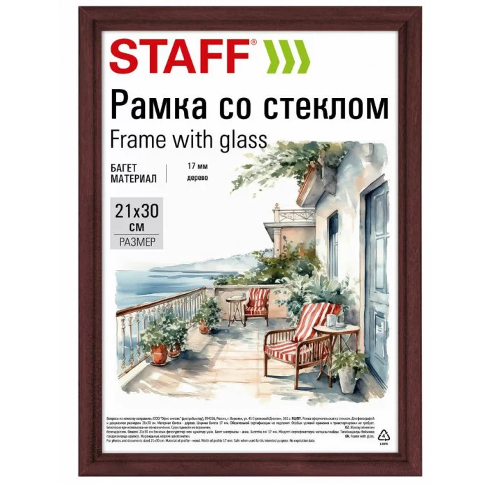 Рамка 21х30 см со стеклом, багет 17 мм дерево, STAFF "Classic", цвет красное дерево, 391364