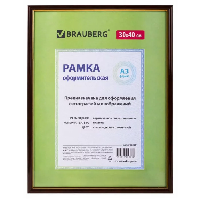 Рамка BRAUBERG "HIT" для оформления фотографий, дипломов, сертификатов, грамот, лицензий и других документов формата А3 (30х40 см) будет гармонично смотреться в любом интерьере - дома и офисе, учебных учреждениях и магазинах, салонах и предприятий и др. Выполнена из пластика цвета "красное дерево" с позолотой, за счет чего отлично впишется в домашний и деловой интерьер. Имеется возможность вертикального и горизонтального подвеса. Ширина багета - 14 мм. Аккуратный вид достигается благодаря стеклянной вставке. Микрогофрокартон обеспечивает плотное прилегание и отсутствие в будущем деформации содержимого в рамке. Термоусадочная пленка гарантирует сохранность рамки при транспортировке, отсутствие сколов и потертостей.