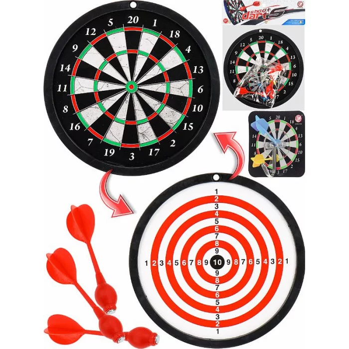 Дартс – популярная игра, которая в последние годы многим полюбилась. Играют семьями, компаниями, проводятся турниры. Как и любая другая игра – дартс имеет свои преимущества и положительно влияет на здоровье человека. Тем более, что она «всем возрастам покорна». Игра стимулирует развитие головного мозга, заставляет концентрироваться и фокусироваться на мишени, чтобы попасть в цель. Играя в дартс, получаешь отличное настроение и новые эмоции. Всегда волнителен бросок дротика и мысли, попадет ли он в нужное место, сможешь ли попасть в самый центр. А уж когда удается выбить желанную комбинацию, радости нет предела! Размер: 18 см. В комплекте: 3 дротика с магнитами, крючок.