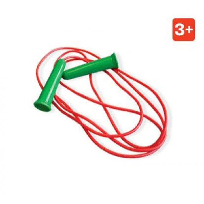Скакалка красного цвета с зелеными пластиковыми ручками. Подойдет для занятий как дома, так и на улице.