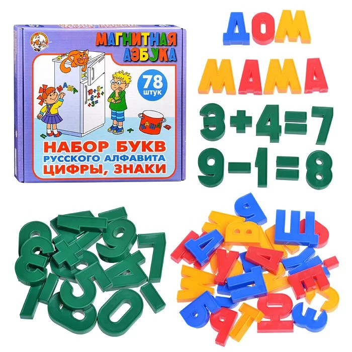 * Набор включает в себя буквы русского алфавита, цифры, знаки и комплект магнитов-вкладышей к ним. Установка магнитов-вкладышей производится ребенком с помощью взрослых гладкой поверхностью наружу.