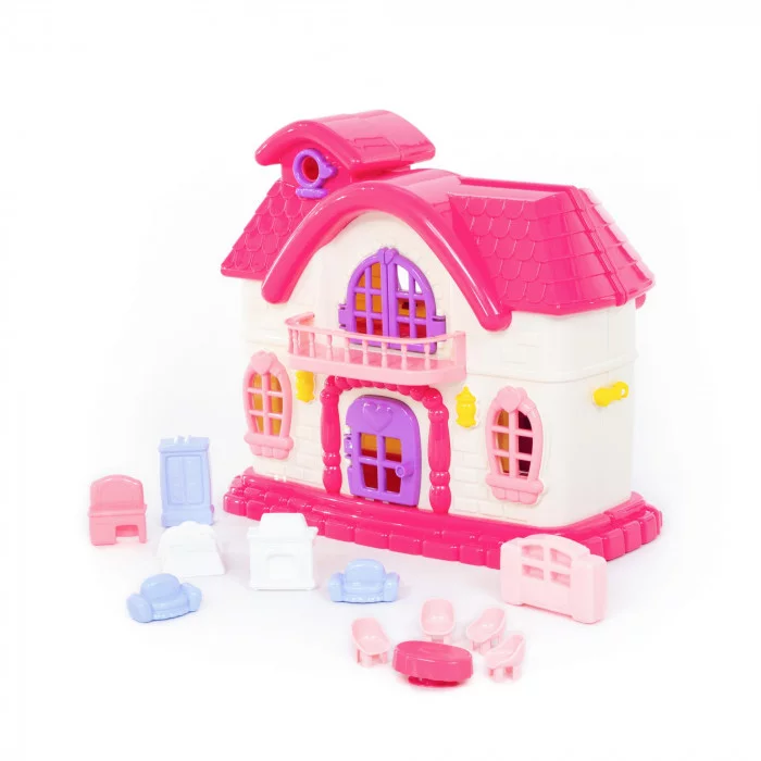 Домик имеет 2 этажа и предполагает несколько зон для игры с куклами. Разнообразит игру и сделает её ещё интереснее наличие дополнительных аксессуаров.