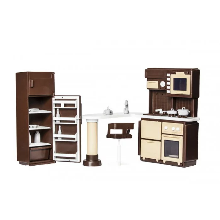 Холодильник; Шкаф, электрическая плита, духовка, микроволновая печь; Барная стойка со стулом; Комплект кухонной утвари; В набор так же входит комплект посуды и миниатюрные игрушки-продукты