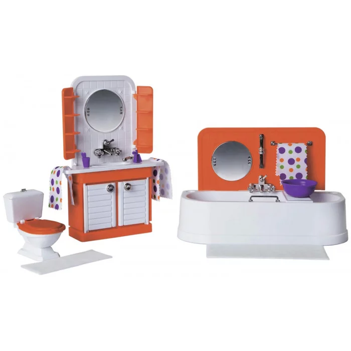 Кроме ванны, шкафа и унитаза, в комплект входят полотенца, мыло, флаконы, зубная щетка, стаканчики. С ней ролевые игры станут еще интересней и реалистичней. Кроме того, крупные элементы ванной сборные, так что для ребенка это еще и увлекательный конструктор. К сборке лучше подключить взрослого, та как имеются мелкие детали, с которыми маленькому ребенку нужно быть аккуратней.