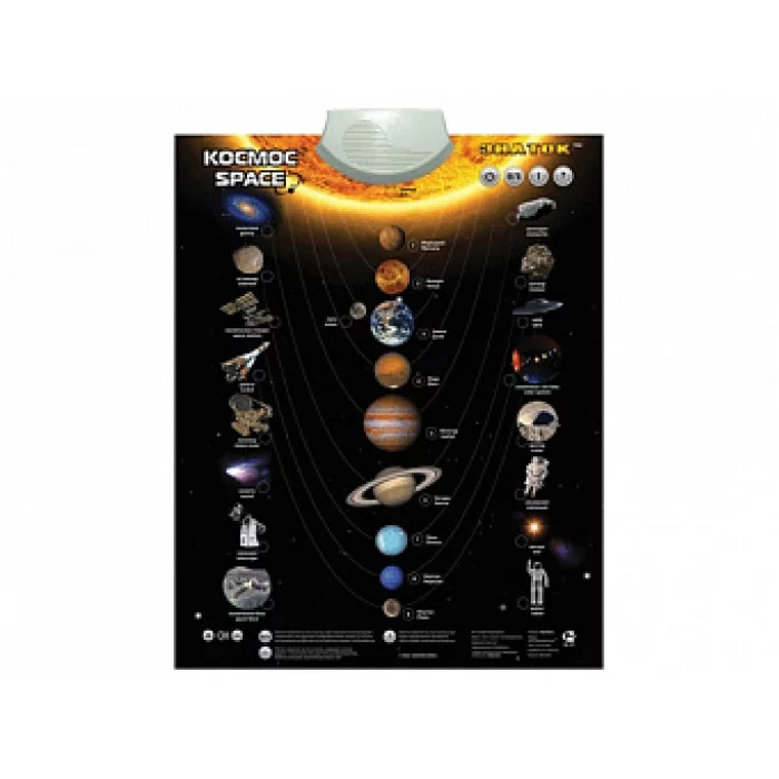 Размер упаковки- 50*23*4 см Электронный звуковой плакат серии ЗНАТОК предназначен для обучения детей старше 3-х лет. Говорящее пособие для домашнего обучения несёт в себе электронный модуль - процессорный блок с динамиком и голосовую запись, заключенную в кнопки, разбросанные по всей площади плёнки полимерного плаката в местах нарисованных планет, космических станций и других летающих предметов. Данное расположение планет относительно Солнца является удобным их представлением для заучивания очень маленькими детьми названий объектов по порядку. Ребёнок научится выговаривать правильно и чётко все названия планет солнечной системы и будет знать самые основные объекты, которые встречаются в космосе, играя с плакатом всего пару часов. Плакат отличается нестандартным способом представления объектов, такое расположение Вы вряд ли встретите в книгах и атласах. Эксклюзивным плакат делает его особенное свойство - самостоятельное озвучивание всех объектов, благодаря чему ребёнок сам слушает пояснения, играет в