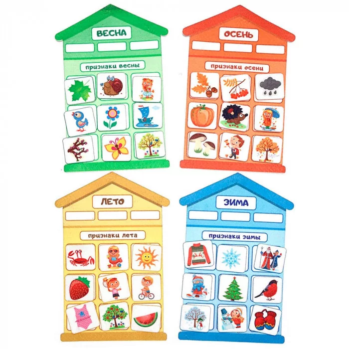 В комплект входят четыре домика, а также маленькие фигур-ки на липучках с изображением деревьев, ёжика, девочки, мальчика, солнца, снежинки, арбуза и т.д.