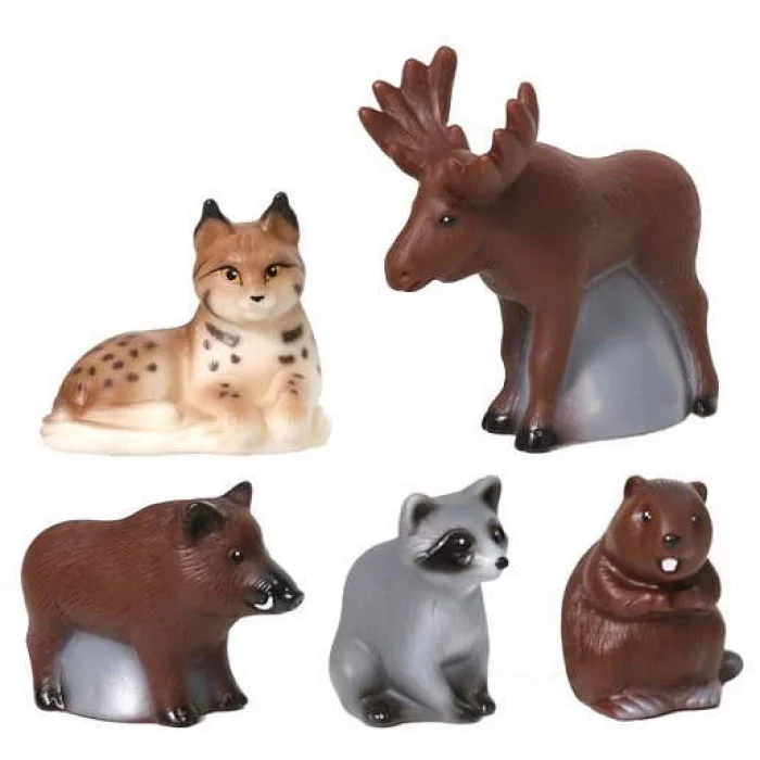 В комплект входит 5 реалистичных фигурок: бобр (5,5 см), енот (5,5 см), кабан (5,5 см), лось (9,5 см), рысь (6 см).