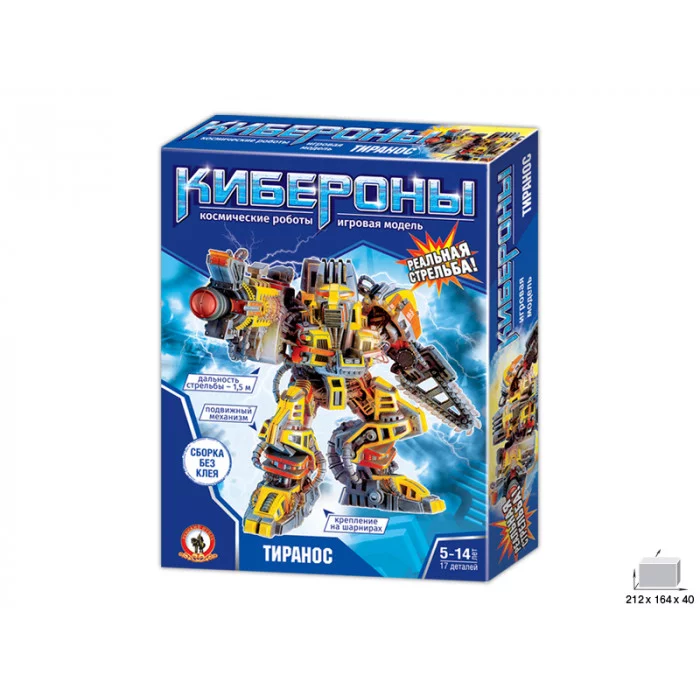 КИБЕРОНЫ – это серия сборных моделей боевых киборгов. Киберон Тиранос – супер-воин с боевым оружием, стреляющим пластмассовыми снарядами. Дальнобойность стрельбы – 1,5 метра. Отличительная особенность робота – мощная пила для поражения соперников. В набор входят детали робота, пластиковые снаряды, подробная инструкция по сборке. Готовая фигурка робота подвижна. Собранную фигурку робота можно раскрасить любыми модельными красками.