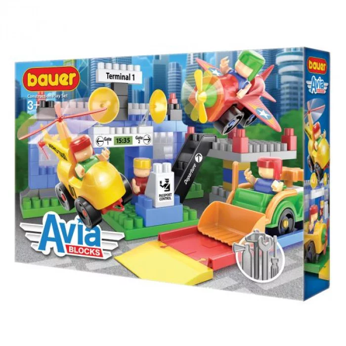 Тематическая серия конструкторов, посвященная авиации.Из деталей конструктора можно собрать собрать здание аэропорта с сотрудником службы контроля, а также погрузчик, вертолет и самолет с пилотом.Входящие в комплект наклейки и тематические аксессуары сделают игру еще интереснее.Конструктор сочетается с наборами других серий от Bauer.В комплекте разноцветные кубики разных размеров, эскалатор, фигурки человечков, элементы декора, наклейки, радары, инструменты.