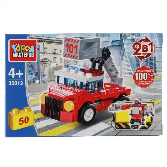Конструктор ПОЖАРНАЯ МАШИНА с люлькой 2в1 (инерция), 50 дет. Город мастеров 35013-JS
