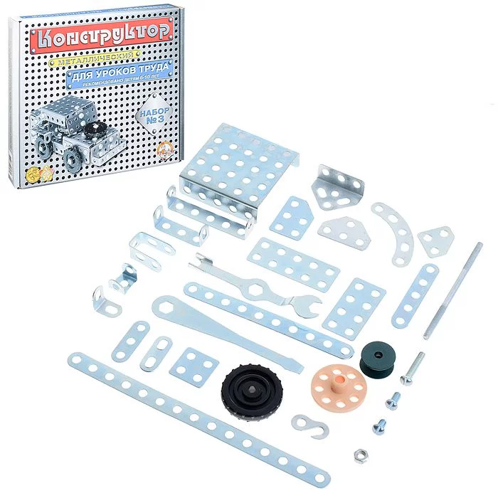 Металлический конструктор №3 для уроков труда – это универсальный набор как для домашнего времяпрепровождения за конструированием, так и для занятий труда в начальных классах школы. Всего набор насчитывает 292 элемента из металла и пластика, из которых можно сконструировать 5 моделей: 2 вида автомобиля, самолёт, коляску и кран. Детали имеют размер от 2 до 15 см, толщина металла составляет 0,8 мм. Расстояние между центрами отверстий – 10 мм. Крепёж имеет резьбу М4.