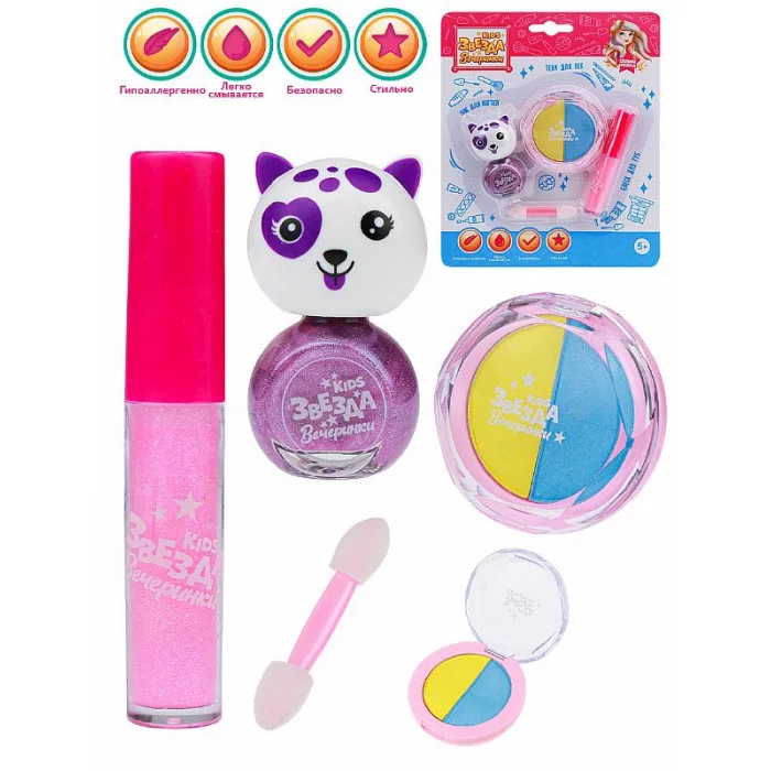 Каждая девочка с юных лет проявляет интерес к косметике и маминой косметичке. Собственный набор детской косметики "Кошечка 16" придется по душе юной моднице! С ним малышка сможет научиться пользоваться косметикой и экспериментировать с новыми образами. В комплекте: блеск для губ 1шт ,лак для ногтей 1шт, тени для век 2шт, аппликатор, цвет микс. Набор продается в планшете.