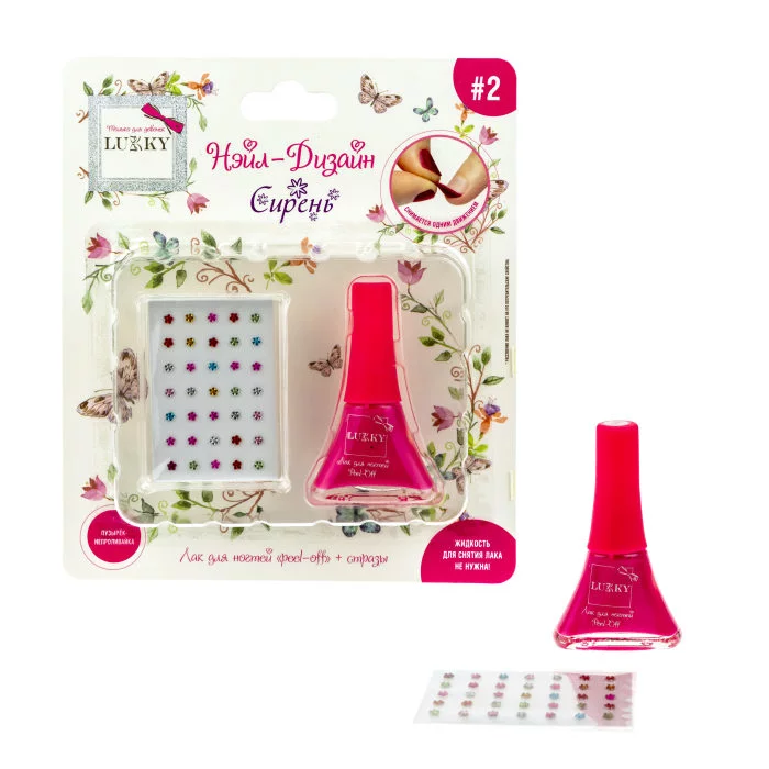 Набор Нэйл-Дизайн лак д/ногтей peel-off ярко-розовый+стразы-наклейки Сирень Т19499 LUCKY 613-288