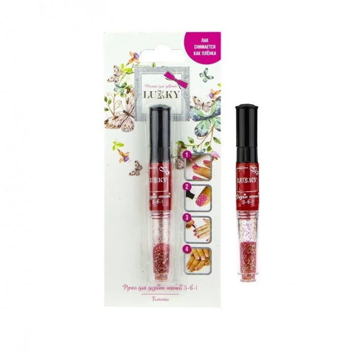 * Lukky 3-в-1 ручка для дизайна ногтей с лаком, цвет красный, с блёстками-в этой ручке есть всё необходимое для создания идеального маникюра! Лак для ногтей красного цвета, блёстки и тоненькая кисточка для рисования на ногтях-выбирайте, какой дизайн будет сегодня у ваших ноготков. Нанесите лак на ноготь и, не дожидаясь высыхания, посыпьте сверху блёстками. Также вы можете с помощью тоненькой кисточки нарисовать ваш неповторимый дизайн. Маникюрготов!