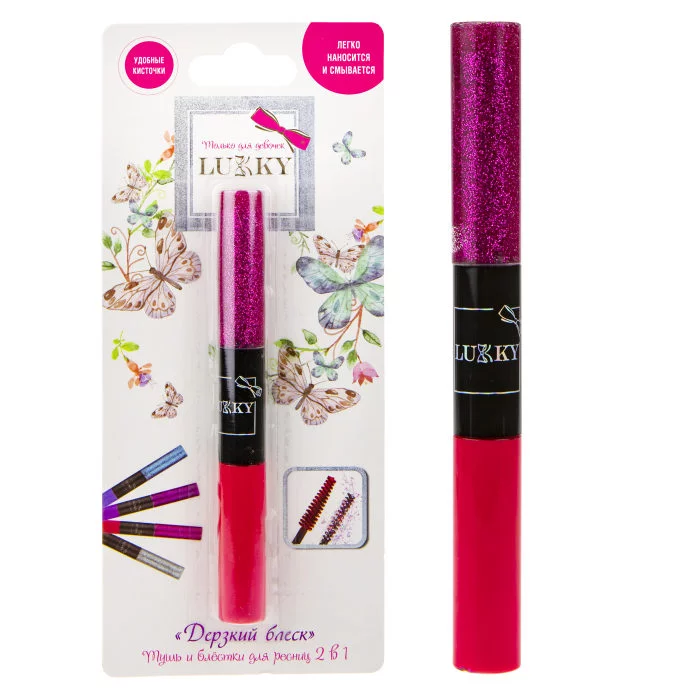 Яркий розовый цвет и переливающиеся розовые блестки совместились в одном продукте-"Дерзкий блеск" от "Lukky" тушь и блестки для ресниц 2-в-1. Создать свой блестящий образ стало еще проще! Чтобы нанести тушь, постарайтесь не моргать. Держите щеточку горизонтально к веку, и начинайте нанесение туши с внешнего уголка глаз. Нанесите тушь, начиная с основания и двигаясь к кончикам ресниц подкручивающими движениями. Самые короткие волоски во внутреннем уголке глаз рекомендуется подкрашивать кончиком щеточки. Не наносите слишком много туши, достаточно 1-2 слоев. А чтобы подкрутить ресницы щеточкой, зафиксируйте ее на несколько секунд около корней. Если хотите прокрасить ресницы нижнего века, подложите под веко бумажную салфетку или ватный диск и выполните макияж кончиком кисточки. После этого откройте флакончик с другой стороны, чтобы нанести глиттер на ресницы. И блестки и саму тушь можно использовать и вместе и по отдельности.