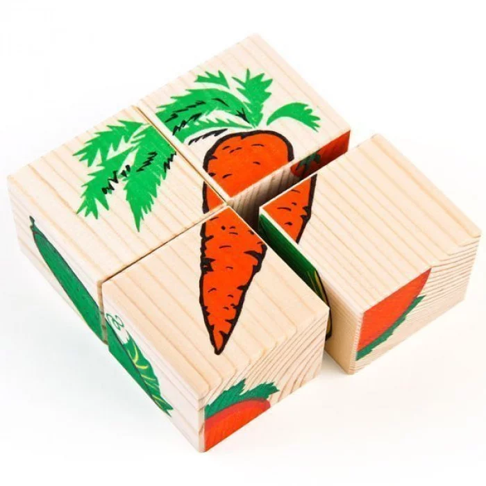 Этот набор деревянных кубиков "Овощи" состоит из четырех элементов и позволит собрать шесть красочных картинок с изображением овощей: свекла, морковь, капуста, огурец, картофель и помидор.