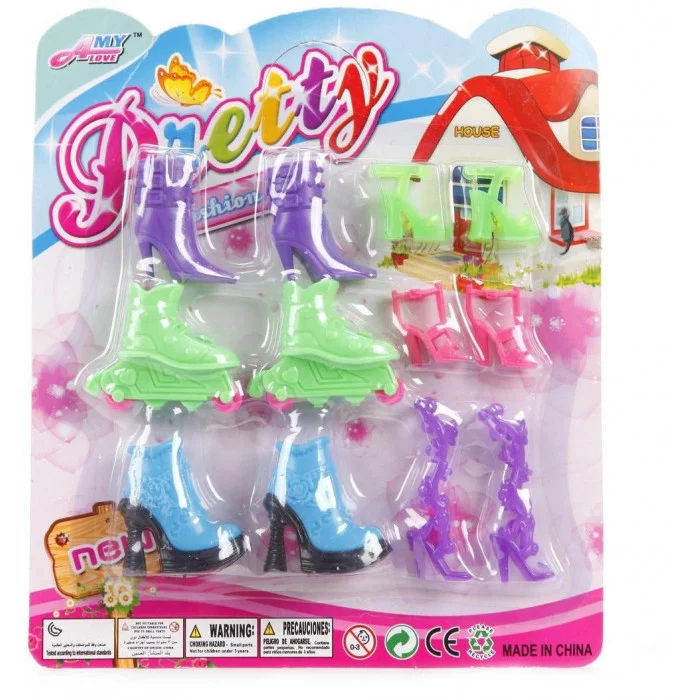 Набор кукольной обуви включает 6 пар, среди которых есть красивые босоножки, сапожки и даже роликовые коньки.