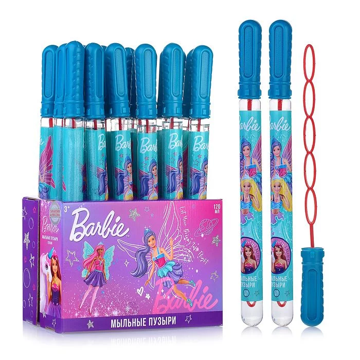 Размер упаковки: 37 х 3 х 3 см Вид упаковки: пластиковая колба Функционал: детское развлечение Страна производитель: Россия Материал: пластик, мыльный раствор Объем: 120 мл Комплектация: мыльные пузыри «Barbie» – 1 шт. Вес: 120 гр. Возраст ребенка: 3+ Мыльные пузыри – это любимая забава для многих детей. Ребенок с большой радостью пускает и лопает мыльные пузырьки. Особенности: - упаковка в виде колбы; - яркий принт с изображением Барби; - объем 120 мл.; - безопасные материалы; - веселая летняя забава.