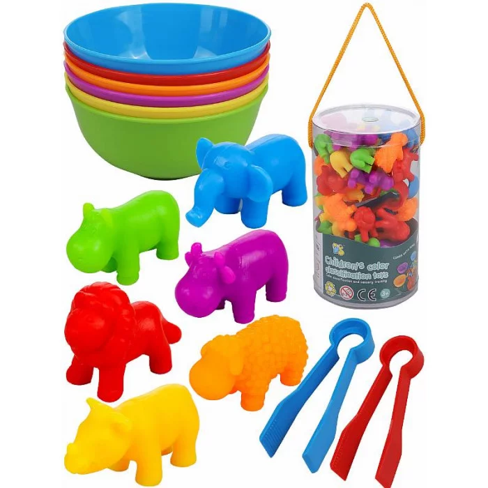 Сортер "Учим цвета. Животные" (17х9х9см., 36 фигурок, 6 цвет. тарелок, 2 пинцета) (арт. И-9397)