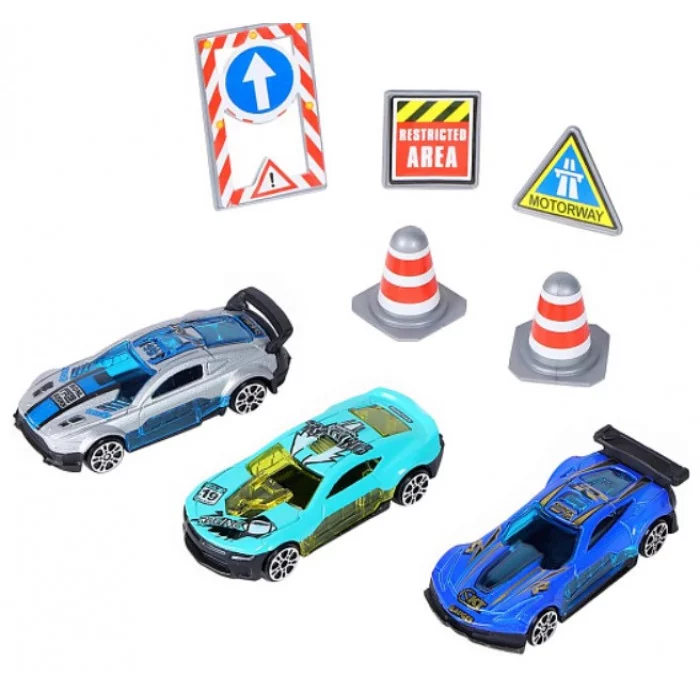 AUTODRIVE Набор металлических машинок, Гоночные машины 3шт с дорожными знаками в/к 23*17, 5*4см. JB0403989