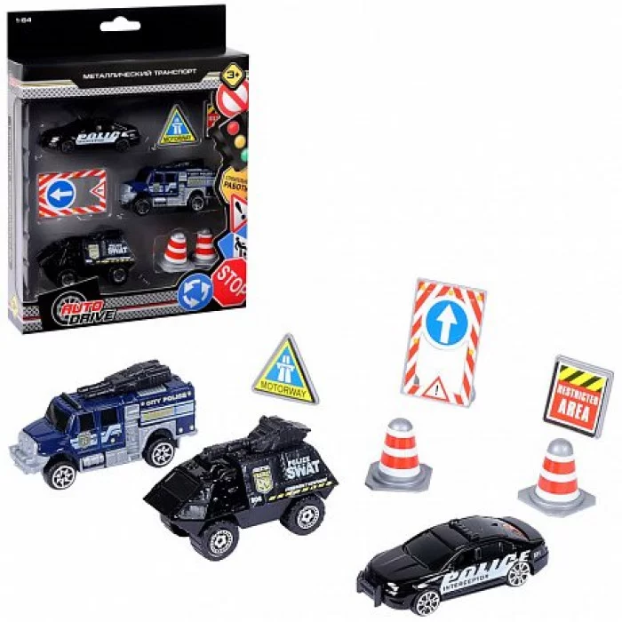 AUTODRIVE Набор металлических машинок, Полицейская техника 3шт с дорожными знаками (машина, внедорожник, бтр) в/к 23*17,5*4см. JB0403980