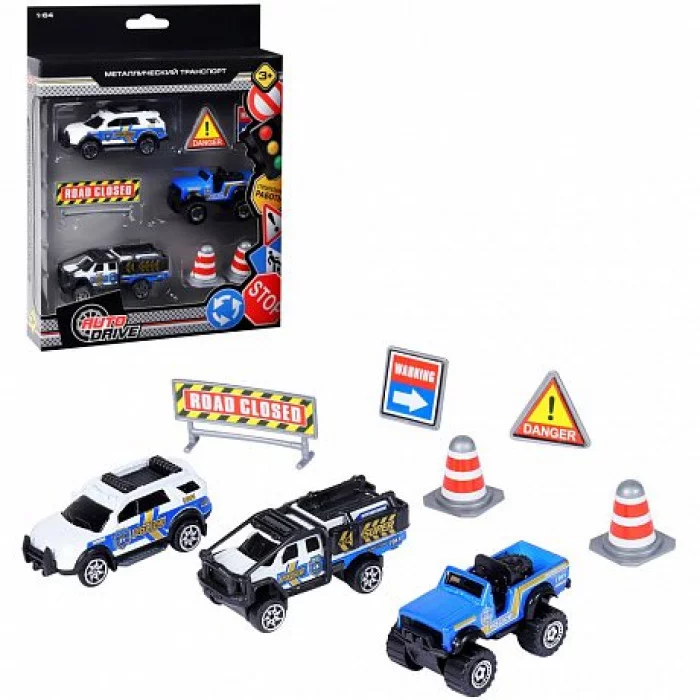 AUTODRIVE Набор металлических машинок, Полицейская техника 3шт с дорожными знаками (внедорожник, фургон, открытый внедорожник) в/к 23*17,5*4см. JB0403987