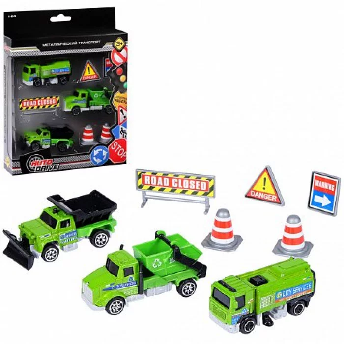 AUTODRIVE Набор металлических машинок, Уборочная техника 3шт. с дорожными знаками (мусоровоз, подметально-уборочная машина, грузовик с грейдером) в/к 23*9,4*4см. JB0403985