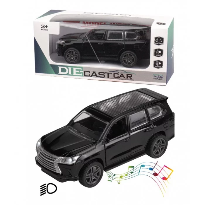 Машинка изготовлена из прочного сплава металла. Размер 1:32 (13см). Оснащена светящимися фарами и звуковыми эффектами. Двери открываются. У данной модели встроенный механизм pul-back. Свет и звук работает при нажатии на оба колеса. Колеса прорезинены, что способствует более лучшему сцеплению с поверхностью. Данная модель представлена в трех цветах: черный, золотой, белый.