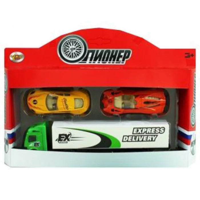 Данный набор включает в себя 3 металлические машинки: 1 грузовую и 2 легковушки. Игрушки выглядят очень реалистично.
