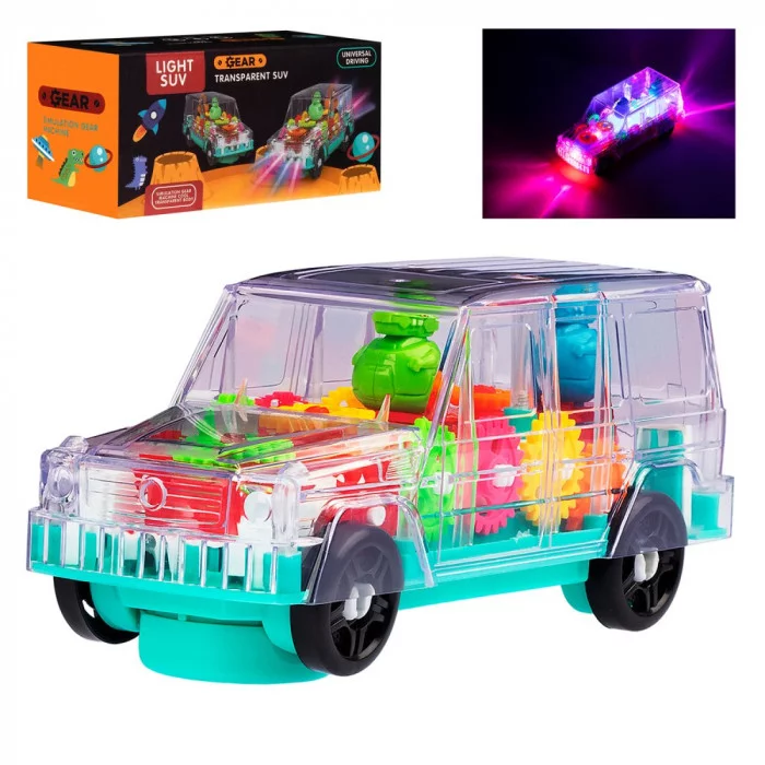 Светящийся внедорожник с музыкой, движущимися внутри шестеренками и светящимися глазами станет для ребенка любимой игрушкой. Прозрачный корпус позволит ребенку увидеть устройство игрушки, наблюдать, как двигаются шестеренки и приводят механизм в действие. Музыкальное сопровождение сделает игру веселее. Весёлые мелодии, сопровождаемые огоньками. Что может быть интереснее? Машинка меняет направление движения при столкновении с препятствием. Обтекаемая форма игрушечной машинки без мелких и острых деталей обеспечит безопасную игру. В составе материалов отсутствуют токсичные компоненты. Игрушка подходит даже для маленьких детей, которые сначала все пробуют на вкус. Также порадует ребёнка любой возрастной категории: как малыша, так и школьника. За счёт своей неординарности игрушечная машинка привлечет внимание не только детей, но и взрослых! Перед использованием не забудьте вставить батарейки и снять защитный колпачок привода внизу игрушки. Размер 18,1 х 7,7 х 8,2 см, от 6 мес. Работает от 3 батареек типа АА (не