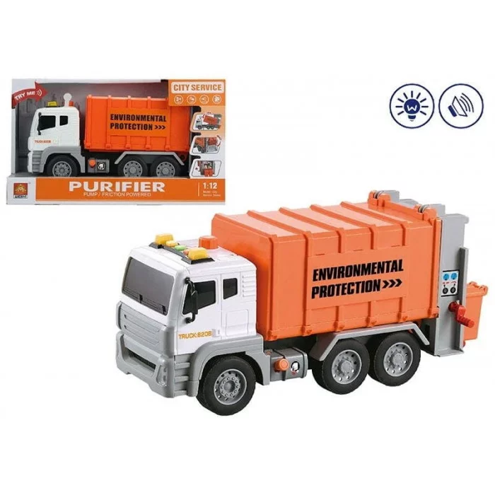Мусоровоз 1:12 инерционный на батарейках (свет, звук) рыжий WY820B