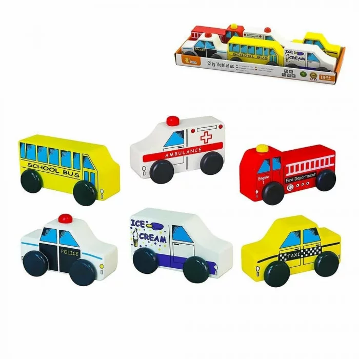 В этот набор деревянных городских транспортных средств входят школьный автобус, скорая помощь, пожарная машина, полиция, машина для мороженого и такси. Отлично подходят для ролевых игр, они доставят вам часы удовольствия!
