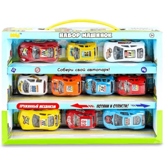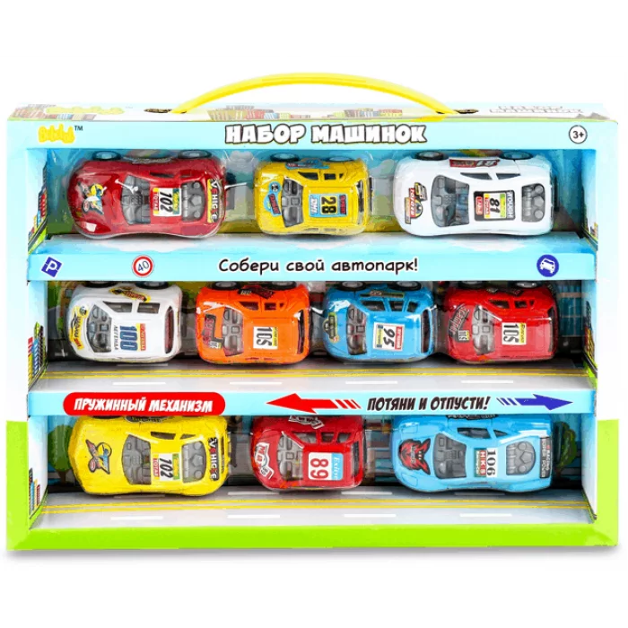 Все машинки в наборе разных моделей, выполнены в ярких, насыщенных цветах. Автомобили оснащены пружинным двигателем - чтобы привести машинку в движение, нужно немного потянуть игрушку назад и отпустить.