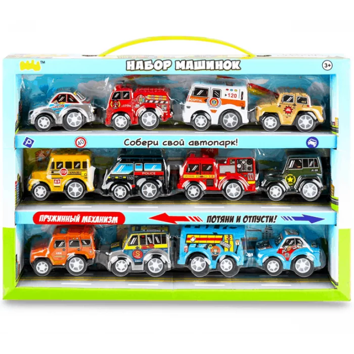 Все машинки в наборе разных моделей, выполнены в ярких, насыщенных цветах. Автомобили оснащены пружинным двигателем - чтобы привести машинку в движение, нужно немного потянуть игрушку назад и отпустить.