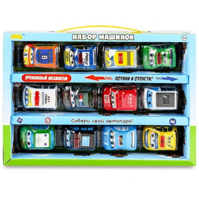 Все машинки в наборе разных моделей, выполнены в ярких, насыщенных цветах. Автомобили оснащены пружинным двигателем - чтобы привести машинку в движение, нужно немного потянуть игрушку назад и отпустить.