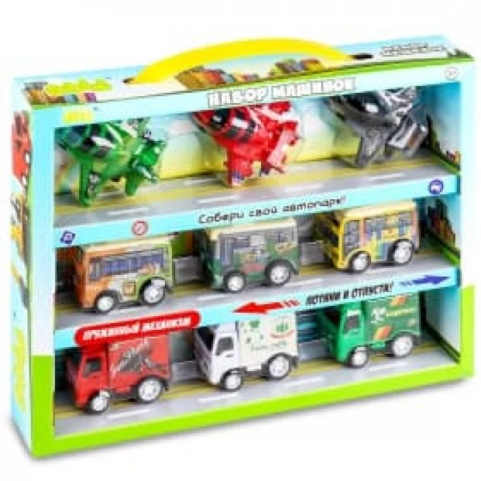 Все машинки в наборе разных моделей, выполнены в ярких, насыщенных цветах. Автомобили оснащены пружинным двигателем - чтобы привести машинку в движение, нужно немного потянуть игрушку назад и отпустить.