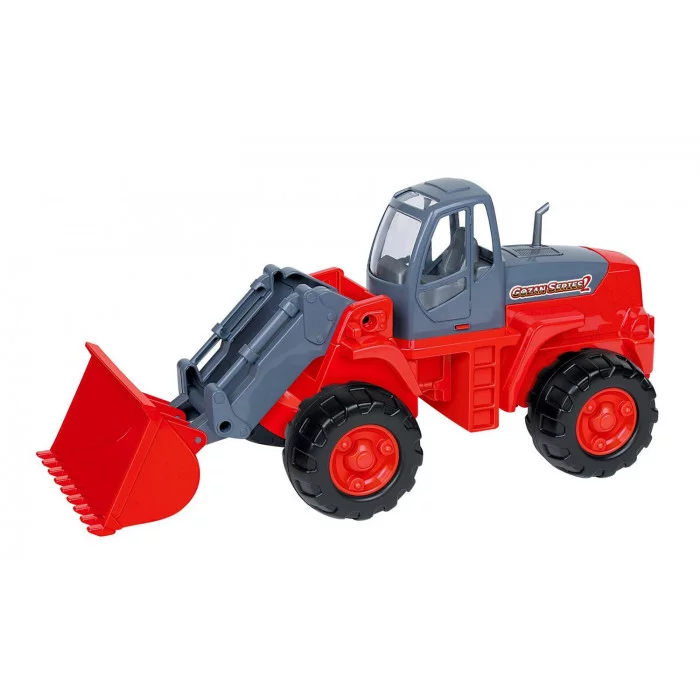 Трактор красно-серого цвета с подвижным ковшом от компании Полесье.