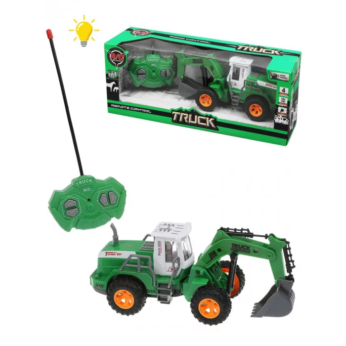 Радиоуправляемый колёсный экскаватор двигается во всех направлениях (вперёд, назад, повороты вправо и влево). Команды задаются нажатием кнопок пульта управления с соответствующими стрелочками. Есть световые эффекты. Игрушка выполнена в масштабе 1:30.