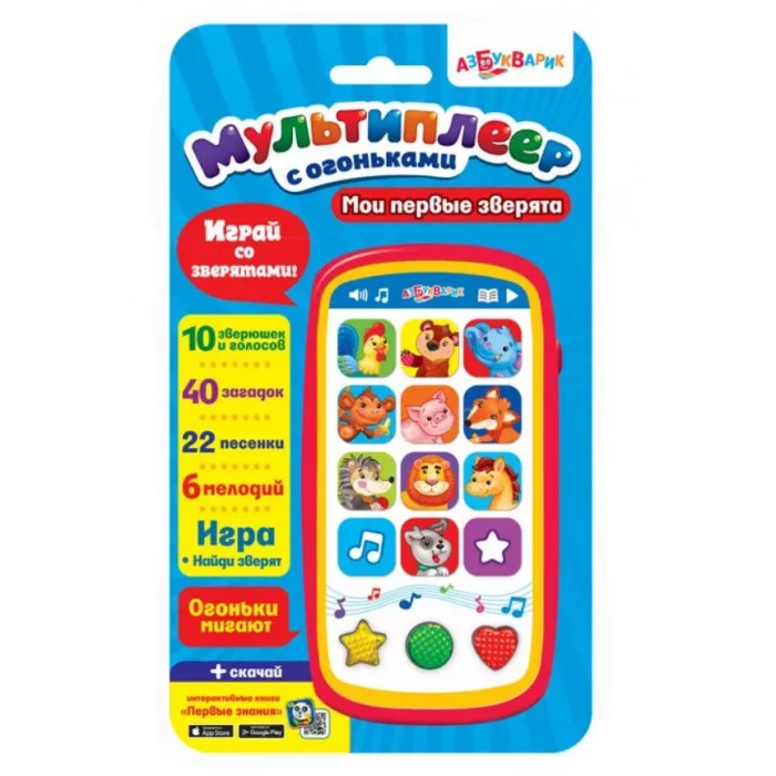 Мультиплеер с огоньками «Мои первые зверята» порадует своим ярким дизайном: он похож на настоящий «взрослый» смартфон. С такой игрушкой малыш будет занят надолго! Мультиплеер способствует расширению кругозора и развивает музыкальный слух, память и мелкую моторику.