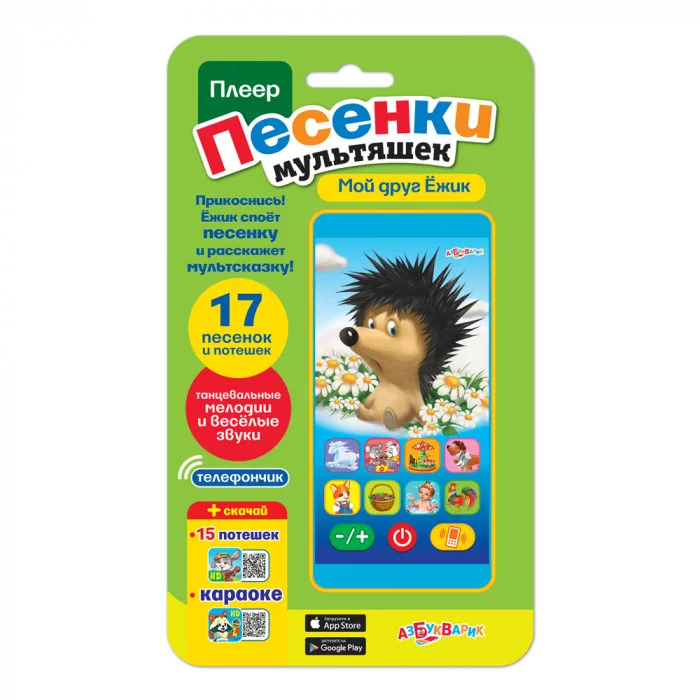 Интерактивный плеер-смартфончик с любимыми мультяшками! Прикоснись к Ёжику, и он расскажет сказку и споёт песенки: «Облака», «По дороге с облаками», «Здравствуй, детство!», «Хвост за хвост», «Неприятность эту мы переживём», «Весёлая карусель», «Спят усталые игрушки», «Человек собаке друг», «Пропала собака». А ещё в весёлом телефончике малыша ждут танцевальные мелодии и забавные звуки. Бонус – 15 интерактивных потешек и музыкальная книга «Караоке» от «Азбукварика»! Найди QR-код внутри упаковки – скачай бесплатно приложение на смартфон или планшет.