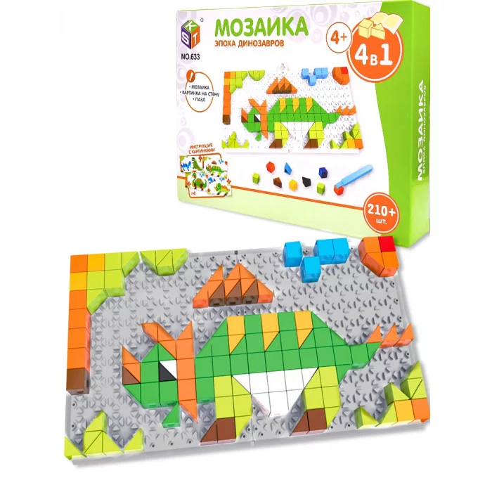 Мозаика 4в1 "ЭПОХА ДИНОЗАВРОВ" понравится любому ребенку! С ней он не только приятно проведет время, но и разовьет пространственное мылшение, логику и мелкую моторику. После сборки можно прикрепить к основе крючок,и повесить готовую картинку на стену. Если вы хотите разобрать картинку, используйте палочку для более легкого отсоединения деталей от основы. В комплекте: детали мозаики (210 шт), основа, крючок, палочка, инструкция. В коробке.